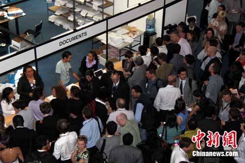 中新社記者現(xiàn)場(chǎng)目擊,在文件發(fā)放處排起了很長(zhǎng)的隊(duì)伍,廣大與會(huì)者特別是談判代表都希望先睹為快。文件發(fā)放處前人潮洶涌,多名聯(lián)合國警察被調(diào)往現(xiàn)場(chǎng)維持秩序。