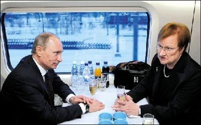 俄羅斯與芬蘭之間首條高速鐵路12日正式開通,俄羅斯總理弗拉基米爾·普京和芬蘭總統(tǒng)塔里婭·哈洛寧共同乘坐首班列車。普京在下車后開玩笑說,由于車速過快,他和哈洛寧都沒有足夠時間交談。這條鐵路是連接俄羅斯和歐洲其他國家的首條高鐵。