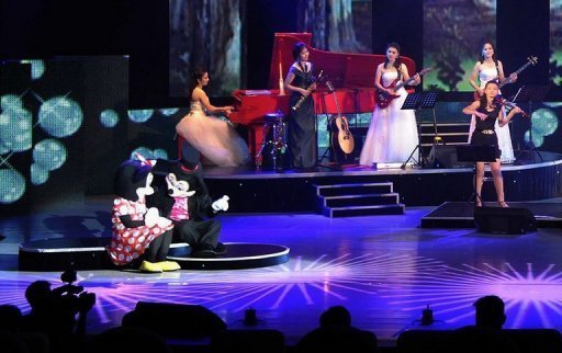 據(jù)報道,牡丹峰樂團由金正恩親自組建,他觀看的這次演出包括美國迪士尼系列的歌舞劇。表演者打扮成米老鼠,小熊維尼等迪士尼知名卡通形象在舞臺上進行表演,同時巨大背景屏幕上播放著“白雪公主”、“美女與野獸”等迪士尼電影片段。