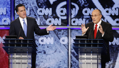 中新網(wǎng)11月30日電 美國共和黨總統(tǒng)參選人羅姆尼和朱利安尼29日在該黨競選辯論中情緒失控,兩人就非法移民問題相互猛烈抨擊。這種憤怒的人身攻擊再次顯示,共和黨內(nèi)競爭極端激烈的提名戰(zhàn)正不斷升高緊張程度。此時距2008年大選第一場提名戰(zhàn)僅35天,那就是依阿華州的黨團會議。