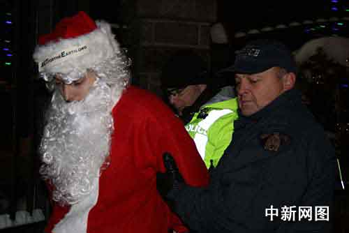抗議行動中,警察一共抓了7名環(huán)保人士,雖有肢體接觸但沒有任何人受傷。一排著紅衣服的“圣誕老人”把囚車塞得滿滿的,剩下一些舉著標語牌的老弱婦孺在原地繼續(xù)游行。