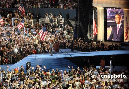 據(jù)“中央社”報道,奧巴馬是在極度興奮的七萬五千名支持者面前接受民主黨總統(tǒng)提名,成為有史以來獲得主要政黨提名的第一位黑人總統(tǒng)候選人。他獲得提名的時間正逢馬丁路德金博士發(fā)表呼吁種族和諧的演說《我有一個夢想》的四十五周年。