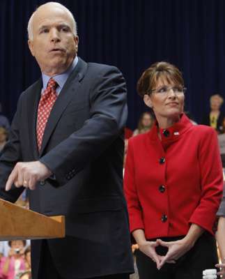 美國(guó)共和黨副總統(tǒng)候選人佩林(右)被指可能拖累麥凱恩(左)的選情
