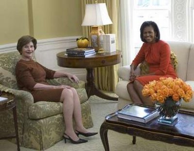 中新網11月11日電 據星島環(huán)球網報道,美國準第一夫人米歇爾10日隨同候任總統(tǒng)丈夫奧巴馬到訪白宮,趁著丈夫與總統(tǒng)布什進行會談的時候,在白宮范圍內到處逛逛看看,包括參觀他們一家兩個多月后便會入住的白宮行政大樓33個房間。為她充當向導的,是已經在白宮住了8年的現任第一夫人勞拉。