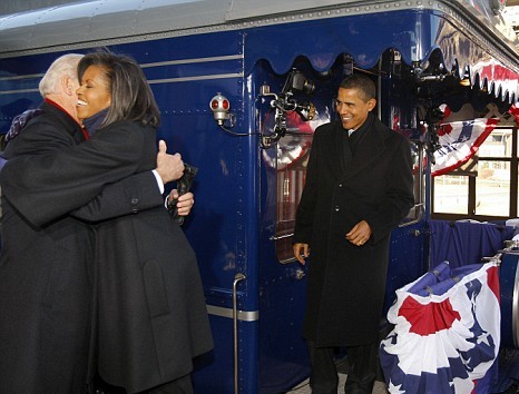 奧巴馬在乘坐專(zhuān)列由費(fèi)城啟程前往首都華盛頓途中,開(kāi)始總統(tǒng)就職的一系列活動(dòng)。當(dāng)天也是其妻子米歇爾45歲的生日,他們?cè)诨疖?chē)上慶祝,兩人沿途又向群眾揮手,很多人夾道歡呼,有人舉起寫(xiě)上“米歇爾生日快樂(lè)”的標(biāo)語(yǔ)牌。