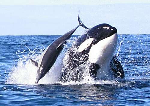 殺人鯨與大白鯊都是海洋中最頂級(jí)的捕食動(dòng)物。雄性殺人鯨可長(zhǎng)達(dá)8米,重8噸。它們有50枚刀鋒似的牙齒,游行速度可達(dá)到50公里/小時(shí)。
