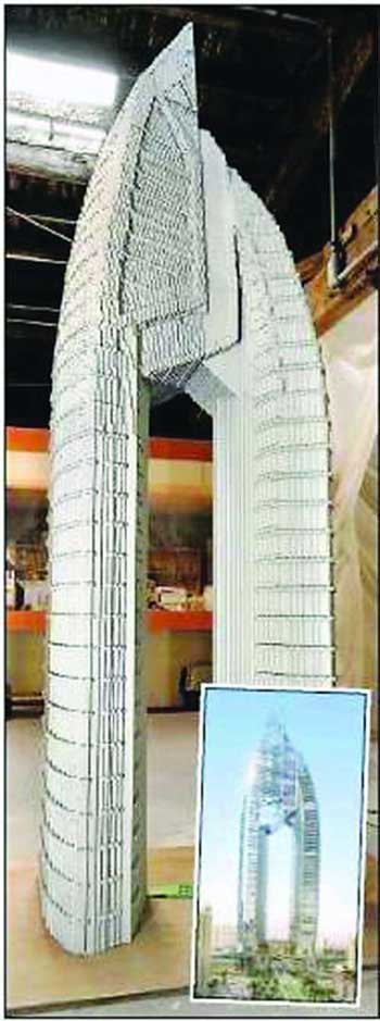 薩瓦亞此次是受迪拜塔的開(kāi)發(fā)商、阿聯(lián)酋納克希爾地產(chǎn)公司的委托,進(jìn)行這項(xiàng)藝術(shù)創(chuàng)作的。預(yù)計(jì)這一坐落于迪拜市棕櫚島上的世界最高建筑將超過(guò)七百米高,于二○○八年底竣工,明年九月正式對(duì)外開(kāi)放。