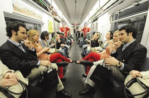 日前,15對同卵雙胞胎按照亞當斯的要求,一起在紐約市布魯克林橋的地鐵站碰頭,15對同卵雙胞胎走進地鐵車廂后,每對雙胞胎都排著隊各自坐在了過道兩側的座位上,并且每個雙胞胎要直接面對著自己的雙胞胎兄弟或姐妹。當15對雙胞胎“各就各位”后,他們接下來要做的事就是盡可能保持動作一致,如果一個雙胞胎用手撓頭,那么他的同卵雙胞胎也必須用手撓頭;一個雙胞胎看報紙,他的同卵雙胞胎也必須低頭看報紙?傊,他們就好像是對方的“鏡中影像”一樣。這些同卵雙胞胎還被告知,如果有乘客詢問他們到底發(fā)生了什么事,他們要表現(xiàn)得一無所知,甚至好像壓根沒看到坐在自己對面的同卵雙胞胎一樣。