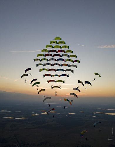 整個過程共計(jì)用時11分鐘。在距離地面1220米的時候,隊(duì)員們分開,美麗的菱形逐漸分解。