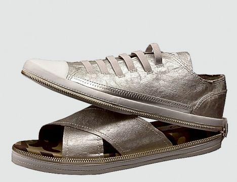 這種多變鞋被稱為Nat-2,它看上去就象一雙普通的匡威牌帆布鞋。但如果你想讓腳透氣,只需解開拉鏈,這時呈現(xiàn)在你面前的就是一雙涼鞋了。帆布鞋的上部能夠很容易地折疊起來,放進包里。目前有20種不同的樣式可供選擇,人們可以根據(jù)自身喜好選擇不同的款式進行搭配。該創(chuàng)意很可能來自于20世紀80年代的動畫片變形金剛。然而與這些到處都能買到的塑料機器人不同的是,人們很難找到出售Nat-2鞋子的商店。目前,在英國唯一取得該鞋子經(jīng)營權(quán)的是位于倫敦西南部亭克漢姆(Twickenham)的 Wild Goose。每雙鞋子的售價為59.99英鎊。