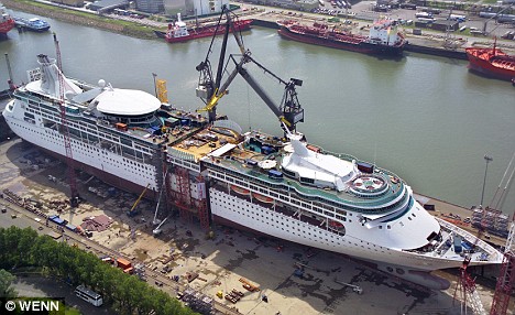中新網(wǎng)8月26日電 綜合報(bào)道,把游輪“一刀兩斷”,然后再塞進(jìn)去一節(jié)船艙,繼而拼裝成一艘“擴(kuò)大版”的客輪,這樣的“大刀闊斧”可不是幻覺,這艘長(zhǎng)916英尺游輪的主人確實(shí)將船鋸開,要將其再擴(kuò)展73英尺。