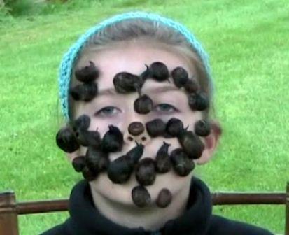 現(xiàn)年9歲的狄安娜•沃爾頓,喜歡動(dòng)物。當(dāng)25只蝸牛在她的眼睛、鼻子以及嘴巴上橫行時(shí),她絲毫不害怕。由此,她打破了由澳大利亞人Liam Kenny支前保持的15只蝸牛上臉的前世界紀(jì)錄。