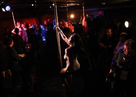 隨后,時(shí)代廣場(chǎng)附近的一家酒吧改造成一家紳士俱樂(lè)部,供模特們進(jìn)行鋼管舞表演。表演時(shí),模特穿上最新款的內(nèi)衣,一次4人,在鋼管上下來(lái)回舞動(dòng),極盡挑逗。