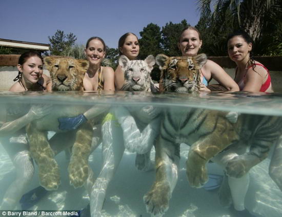 據(jù)英國(guó)《每日郵報(bào)》報(bào)道,在海邊的游泳者要不時(shí)巡視海面以防大鯊魚(yú),不過(guò),對(duì)于美國(guó)南卡羅萊納州一家動(dòng)物園的女訓(xùn)獸師們來(lái)說(shuō),與小老虎們一起游泳已是她們的例行工作。
