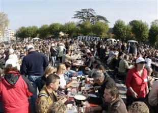 他們把980千克奶酪和420升白酒混合在一起攪拌,然后將成品分成950鍋,分發(fā)給5000名食客。這些觀眾把意大利的經(jīng)典白面包倒在這融化的奶酪里,津津有味地品嘗,場(chǎng)面極其壯觀。