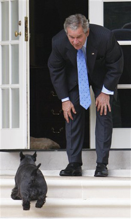 2007年9月28日,美國總統(tǒng)布什結(jié)束國務(wù)院的會(huì)議后,在白宮與他的小狗巴尼嬉戲。
