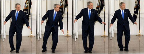 2008年3月5日,在獲得黨內(nèi)提名所需的1191張黨代表票后,美國共和黨總統(tǒng)候選人約翰·麥凱恩前往白宮,與總統(tǒng)布什共進午餐,作為布什正式宣布支持他的前奏。但布什卻被麥凱恩晾在白宮北門等了好一會兒。早早來到白宮北門的布什左等右等麥凱恩不到,為了調(diào)節(jié)氣氛,竟然在眾位記者面前獨自跳起踢跶舞來。