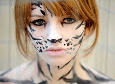 該女子身上涂滿了彩繪,把自己關(guān)在一個籠子里,手持“不要再和動物;ㄕ小钡臉苏Z。