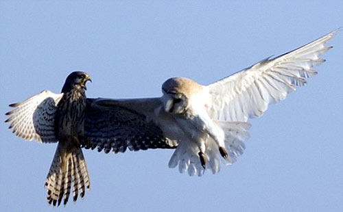 “能看到這一幕真的非常不可思議。谷倉(cāng)貓頭鷹堅(jiān)持不懈的尋找野鼠一類的食物,但每次總會(huì)遭到茶隼的襲擊! 據(jù)攝影師介紹:“它們?cè)诳罩姓归_(kāi)激烈搏斗,最終貓頭鷹會(huì)選擇放棄,并丟下自己的獵物逃跑,但貓頭鷹還會(huì)再回來(lái)。這種戰(zhàn)斗會(huì)進(jìn)行好幾次,直到茶隼吃飽喝足,貓頭鷹才能安心享用自己所捕到的食物!
