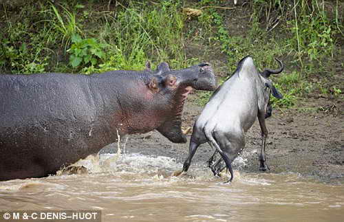 據(jù)英國《每日郵報》報道,一只黑尾牛羚從一頭饑餓(或者說是心情不好)的河馬口中死里逃生。張著大嘴的河馬看上去發(fā)現(xiàn)了一個非常容易對付的目標(biāo)。