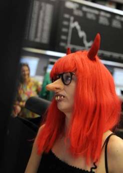 中新網(wǎng)2月27日電 據(jù)路透社報道,德國一年一度的杜塞爾多夫狂歡節(jié)日前達(dá)到高潮,但DAX股指卻于23日當(dāng)天降至2004年10月底以來的最低點(diǎn),不過這并未妨礙金融業(yè)者加入狂歡的盛宴。日前,他們在沉悶的證交所里開起化妝舞會。交易員們秀絲襪美腿,化妝搞怪。