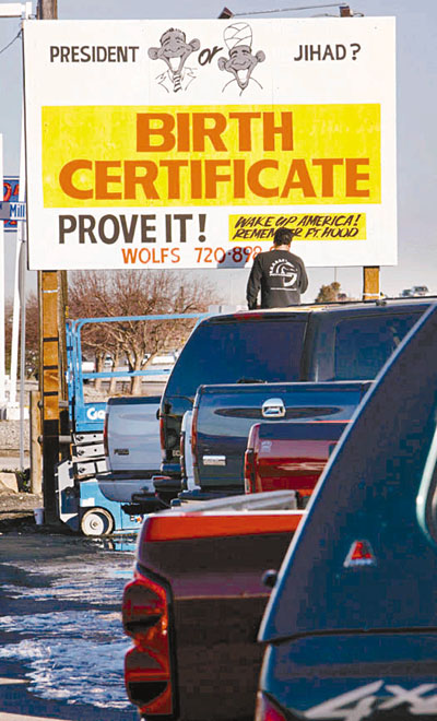 據(jù)香港《文匯報(bào)》22日?qǐng)?bào)道,這幅廣告牌豎立于距離丹佛以西11公里的第70號(hào)州際公路旁,剛于前日由藝術(shù)家里爾完成。奧巴馬卡通肖像下有一個(gè)黃色大方格,上書(shū)“出生證書(shū),請(qǐng)證明!“顯然在質(zhì)疑,奧巴馬是否真的在夏威夷出生及擁有美國(guó)公民身份。