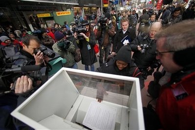 第三屆“大掃除日”(Good Riddance Day)前天在紐約時(shí)報(bào)廣場(Times Square)舉行,現(xiàn)場碎紙機(jī)轉(zhuǎn)個不停,一年來的厄運(yùn)也象征性的一掃而空。