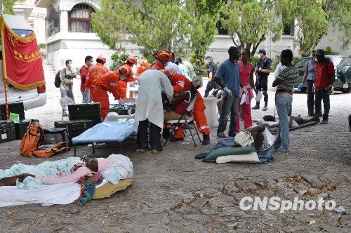 海地當地時間14日9時,中國武警總醫(yī)院赴海地國際救援醫(yī)療分隊開設第一個流動醫(yī)療點,已為110名受傷的災民提供醫(yī)療救助。海地總理禮賓官趕到醫(yī)療救助點,他握著來自中國武警總醫(yī)院的醫(yī)生的手說:“感謝中國國際救援隊,你們是第一支來總理府進行人道主義救助的救援隊”。