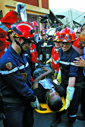 法國救援隊(duì)23日從瓦礫里救出了一名24歲的海地男子。這名男子已經(jīng)被埋了11天。救援隊(duì)員們激動(dòng)地說:“這簡直就是生命奇跡。”