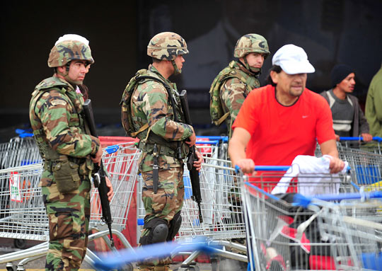 雖然智利政府已開(kāi)始免費(fèi)發(fā)放食品,但由于大規(guī)模救援遲遲未能展開(kāi),2月28日和3月1日,康塞普西翁兩度發(fā)生大規(guī)模哄搶現(xiàn)象,搶掠者甚至放火燒了一家超市。