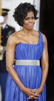 當(dāng)晚,奧巴馬夫人米歇爾再次閃亮登場(chǎng),其著裝打扮又被眾媒體拿來(lái)評(píng)點(diǎn)一番。米歇爾穿了亮藍(lán)色單肩拖地長(zhǎng)裙,腰間系上銀色腰帶,并佩戴了銀色耳環(huán)。