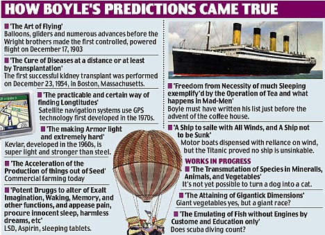 在博伊爾的榜單中包含了在他那個(gè)年代看似怪異的想象,包括夜幕中的航空旅行和止痛藥物的發(fā)現(xiàn)。