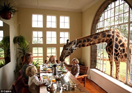 每天快到九點時,這些長頸鹿就把腦袋伸進窗戶里,等待主人準(zhǔn)備他們的早餐。這種羅斯切爾德長頸鹿是長頸鹿中的第二大瀕危種群。妻子坦雅說:“這個莊園以前的主人在長頸鹿的繁育方面做得很成功,我們也將繼續(xù)下去。”