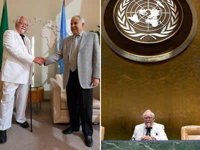 這位名叫湯普森的男子一頭白發(fā),戴著眼鏡,身穿肯德基創(chuàng)始人桑德斯上校標(biāo)志性的白色西裝,打著黑色領(lǐng)結(jié),不知為何成功避開了嚴(yán)密的安保措施,混進(jìn)位于美國紐約的聯(lián)合國總部大樓。他提出與聯(lián)合國大會新任主席、利比亞前外長阿里.圖里基握手合影,得到了對方回應(yīng)。湯普森還成功地在聯(lián)大主會堂的聯(lián)合國徽標(biāo)下拍了多張照片,從照片上看,好像在開會。