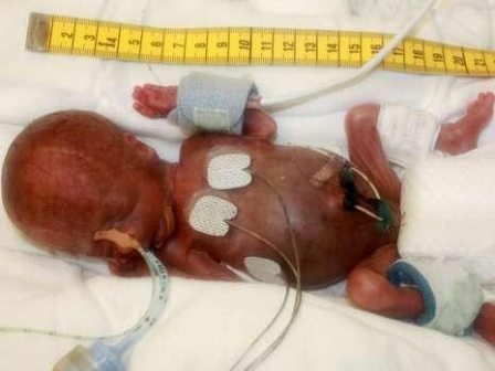 這名男嬰于2009年6月出生,比預(yù)產(chǎn)期提前了15周。當(dāng)時(shí)他在母親體內(nèi)有危險(xiǎn),醫(yī)生立即實(shí)施了剖腹產(chǎn)。出生時(shí)男嬰極其纖弱,大小和一張A4紙差不多,體重只有275克,輕得像一塊黃油。醫(yī)生不得不把他放在保育箱里,但是仍然不能保證其成活。經(jīng)過6個(gè)月的精心護(hù)理,2009年12月,這名男嬰體重增加到3.7公斤,和一名足月的新生兒差不多大小,順利出院。