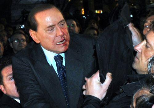 中新網(wǎng)12月14日電 當(dāng)?shù)貢r(shí)間13日,意大利總理貝盧斯科尼在米蘭市中心的米蘭大教堂附近參加一場(chǎng)政治集會(huì),發(fā)表完演講離開時(shí)遭到一名中年的男子的襲擊。該男子隔著保鏢向他的右臉方向扔去一件重物,導(dǎo)致其鼻骨輕微骨折,兩顆牙齒斷裂,嘴唇內(nèi)外也都受傷,需要在醫(yī)院接受24小時(shí)觀察,以及為期20天的治療。消息一出,舉世嘩然。