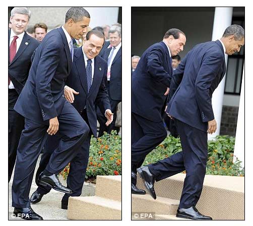 據(jù)英國(guó)《每日郵報(bào)》7月9日?qǐng)?bào)道,作為G8峰會(huì)上的重量級(jí)人物,奧巴馬的到來(lái)讓意大利總理貝盧斯科尼喜出望外。然而這次貝氏可謂是“熱臉貼上了冷屁股”,他滿(mǎn)臉堆笑地伸出手,要和奧巴馬握手,但對(duì)方卻對(duì)他“視而不見(jiàn)”,直接從他前面走過(guò)。