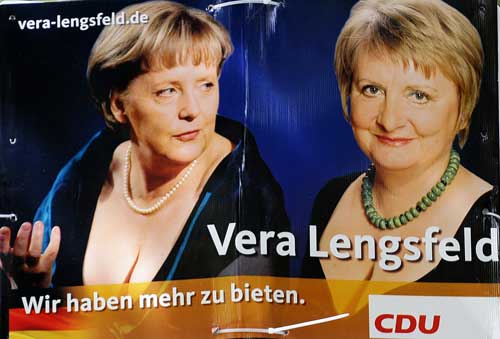 據(jù)新加坡《聯(lián)合早報(bào)》報(bào)道,德國(guó)基督教民主聯(lián)盟成員倫斯費(fèi)爾德將在下個(gè)月27日的選舉中,競(jìng)選柏林一個(gè)左翼選區(qū)的議席。她的競(jìng)選團(tuán)隊(duì)最近張貼的競(jìng)選海報(bào),展示了她本人和默克爾并列在一起的照片。兩人都穿上低胸晚裝,露出了性感乳溝,上頭還打上“我們還有更多可以奉獻(xiàn)”的標(biāo)語(yǔ)。