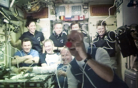 此次在國際空間站逗留、觀光期間,拉利伯特干起雜技演員老本行,戴上小丑鼻子道具,在零重力狀態(tài)下與自己的孩子們進行視頻通話。此外,他還完成了一項特殊使命──在國際空間站與地面舉行了“地空聯(lián)機”,呼吁公眾關(guān)注水資源問題。