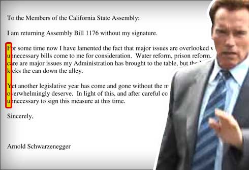 然而,施瓦辛格的過人“幽默感”與反擊方式不僅止步于此。他在否決這項法案的特別咨文中,竟以“藏頭詩”的方式狠狠羞辱了政敵阿米阿諾。從信的正文第二自然段起,將每行左邊第一個字母挑出來,豎著念,就能拼成兩個單詞,而這兩個單詞可謂是全球最廣為人知、也堪稱美國“國罵”的不雅詞匯?梢娺@位曾經(jīng)對著萬千觀眾大秀肌肉的好萊塢猛男玩起文字游戲來,一點也不含糊。