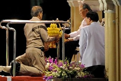 81歲的泰王普密蓬在王后詩麗吉、哇集拉隆功王儲(chǔ)、王室家庭成員以及首相阿披實(shí)的陪同下,出席了該活動(dòng)。他身穿一件白色的外套,坐在輪椅上向數(shù)百名前來為他祈福的民眾揮手。