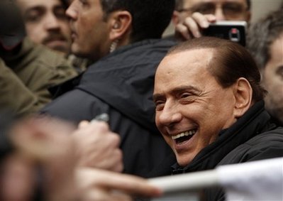 貝盧斯科尼抵達(dá)在羅馬的官邸時(shí),受到了很多支持者的歡迎,他們打出“歡迎回來”的條幅。貝盧斯科尼表示感覺良好。