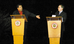 據(jù)外電報(bào)道,22日在墨西哥召開(kāi)的拉美峰會(huì)上,委內(nèi)瑞拉總統(tǒng)查韋斯與哥倫比亞總統(tǒng)烏里韋互相指責(zé),甚至口出侮辱性詞語(yǔ)。查韋斯后來(lái)拂袖而去,而烏里韋不依不饒,諷刺查韋斯應(yīng)該“像個(gè)男人一樣承擔(dān)爭(zhēng)吵的后果”。