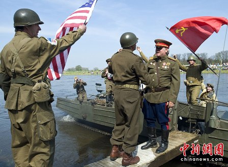 1945年4月25日,一支美軍偵察隊(duì)與一隊(duì)蘇軍在德國城市托爾高(Torgau)南部易北河畔的一座橋上勝利會師,一幅美蘇兩軍士兵握手的照片從此傳遍世界,成為反法西斯戰(zhàn)爭歐洲戰(zhàn)場出現(xiàn)勝利曙光,希特勒政權(quán)即將滅亡的最廣為人知的象征之一。