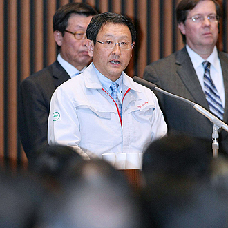 身著一身灰色夾克式工作服的豐田章男在公司總部向2000多名在場(chǎng)的員工鼓勁稱:“讓我們抖擻精神,以謙卑的態(tài)度和十足的信心迎接未來(lái)的挑戰(zhàn)”。他說,從今天起,豐田公司將“從頭再來(lái)”。