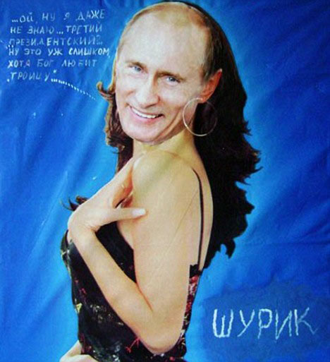 普京一向以“硬漢”形象示人,如今一個心懷不滿的畫家,竟然將這個“硬漢”畫成一個身穿低胸吊帶緊身裙,擁有一頭波浪長發(fā),并戴著大耳環(huán)的女人。這名畫家已經(jīng)被俄羅斯秘密警察拘捕。對于自己涉嫌羞辱總理的行為,該畫家解釋說自己是對普京還想當(dāng)總統(tǒng)一事表示抗議。