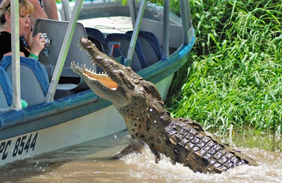 根據(jù)保羅的描述,當看到河上那只懶洋洋的鱷魚后,船上的導游就用木棍敲打水面,希望能吸引鱷魚更靠近一些。“鱷魚果然隨著木棍游來,越來越近,當大家都還沒轉(zhuǎn)過神時,那只原本溫順的鱷魚突然躍出水面,張著血盆大口朝那位女游客撲過去!边@時船上的所有游客都尖叫起來,大家都拼命向后退。