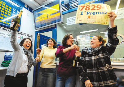 主辦單位表示,有1950張彩票出現(xiàn)中獎(jiǎng)號(hào)碼,全部都是在馬德里巿中心彩票辦事處出售。按總彩金23.2億歐元計(jì)算,每位得獎(jiǎng)持票人可獲30萬(wàn)歐元獎(jiǎng)金。