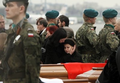 據(jù)報(bào)道,14日,載有30名遇難者靈柩的飛機(jī)抵達(dá)波蘭;15日,又有飛機(jī)搭載34名遇難者靈柩飛抵波蘭華沙一間軍用機(jī)場(chǎng)。這些被運(yùn)回故鄉(xiāng)的遇難者當(dāng)中,包括波蘭流亡總統(tǒng)卡丘羅夫斯基的遺體。