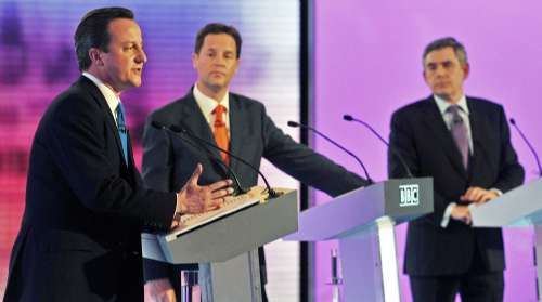 工黨領(lǐng)袖布朗、保守黨領(lǐng)袖卡梅倫和自由民主黨領(lǐng)袖克萊格分別就削減財政赤字、減少稅收、銀行監(jiān)管和英國制造業(yè)等一系列問題交鋒。